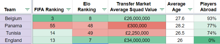 Panama are going to be the whipping boys, at their first World Cup and with a squad who would have performed much better in Mexico. In the likely starting 11 we have Blaz Perez (aged 37), Alberto Quintero (30), Gabriel Gomez (34), Felipe Baloy (37), Luis Tejada (36) and Jaime Penedo (36). To say legs might be arguing with brains is probably a fair statement. They also qualified from a Central American group with negative goal difference before enduring woeful results in the build up against mediocre opposition.