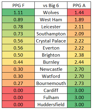 Nuno Espirito Santo certainly looks the real deal when it comes to his big game set up. The below table shows how the teams placed 7th-14th have got on against the Big 6 this season. It’s a stark display of just how well Wolves have performed. Column 1 shows points per game collected, with the second showing points per game won by the Big 6 opponents.